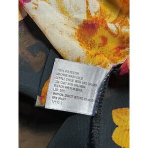 lightweight, sheer blouse featuring a vibrant, large-scale floral print on a black background. The design is characterized by its bold use of warm tones, including deep orange, bright yellow, and hints of pink and green, creating a high-contrast "tropical" or "garden" aesthetic.