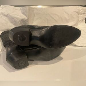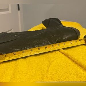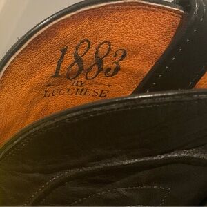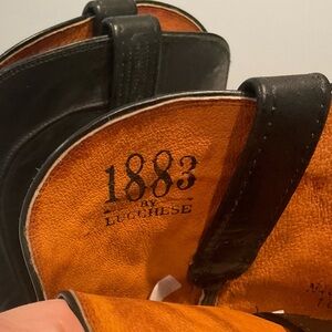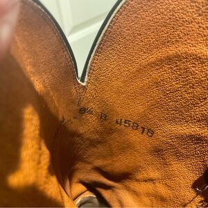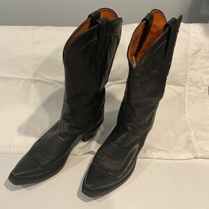 Authentic Lucchese leather cowboy boots. Pointed toe and detailed stitching on vamp and shaft. Easy pull tabs at the top. Slim, mid-height stacked heel for dress or casual wear. See photo 7 for small cut in leather upper.