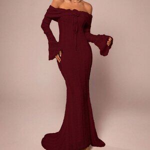Turn heads in this burgundy elegant maxi dress, featuring an off‑shoulder neckline and sweet floral accents that add a romantic touch. The high‑waist, slim‑fit silhouette is enhanced by a pencil‑shaped hem and flare sleeves, creating a graceful flow from the fitted bodice to the floor‑length skirt. Fully lined for comfort, the dress offers a refined look perfect for date nights or special occasions, blending classic style with contemporary flair.