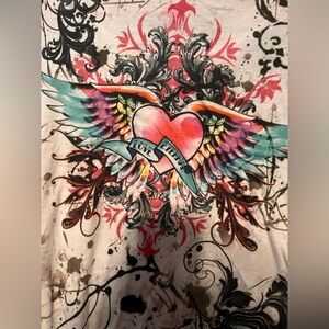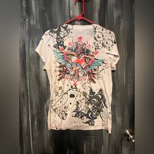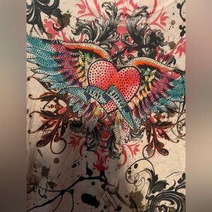 Vibrant tee with heart and wing design. Features intricate patterns. Perfect for casual wear.