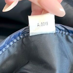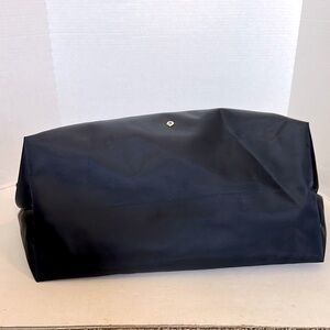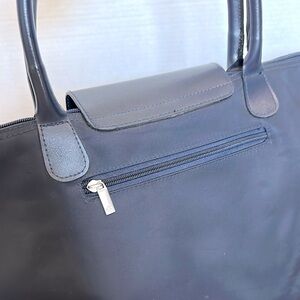 A navy blue foldable tote bag with navy handles, a flap closure, and a silver logo. Samsonite Foldable Tote Carry-On Travel Bag This type of bag is designed to be lightweight and packable, making it convenient for travel or everyday use. The bag is made from nylon and is water resistant.