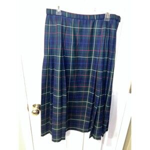 This vintage Pendleton Signature Pleated Skirt in women's size 14 is a stylish and versatile piece perfect for various occasions such as travel, parties, casual outings, work, and business events. Made from wool tweed with a high rise and pleated accents, this midi-length skirt exudes a preppy and academia-inspired vibe. The green plaid pattern adds a touch of vintage flair, while the lined interior ensures comfort and quality. Dry clean only to maintain its appearance, this skirt is a timeless addition to any wardrobe, ideal for the fall, winter, and spring seasons.