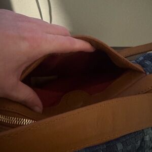 • Woven denim exterior with leather trim