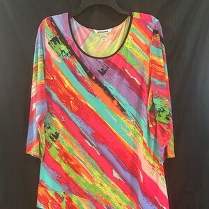 Peter Nygard top, abstract print tunic, colorful tunic blouse women, multicolor stripe top, artistic blouse women, Peter Nygard tunic top, 3/4 sleeve tunic blouse, bold print blouse women, work casual tunic top, lightweight tunic blouse, women colorful top