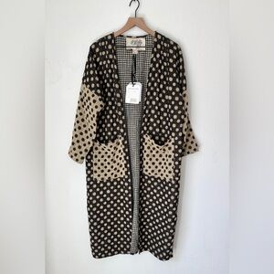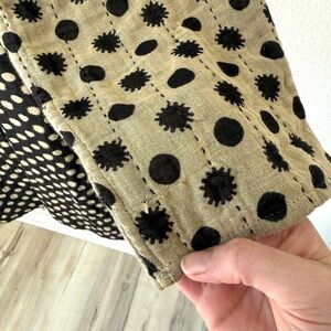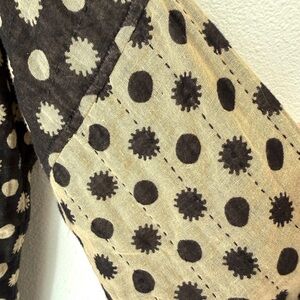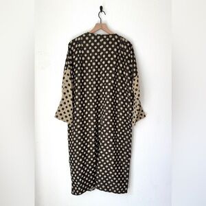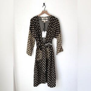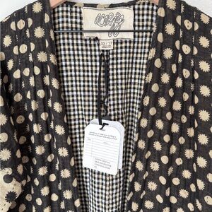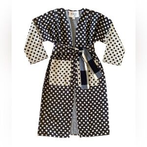 Quilted robe with mixed polka and gingham pattern called constellation. Fully reversible with an oversized fit. Cream dots and sunburst motifs on a black ground. Contrast gingham interior. Front tie closure. Relaxed, layered silhouette. A coveted Ace piece that is hard to find. XS, with tags. Rarely worn. A few snags as shown, typical of a cotton gauze fabric.