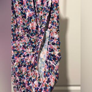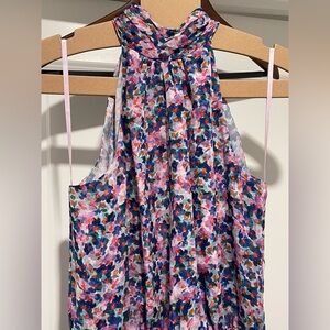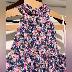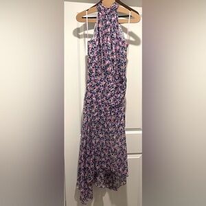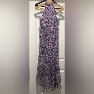 Veronica Beard's Leia midi-dress is topped with a halter neck draped elegantly in soft silk, adorned with a bright floral print.