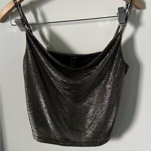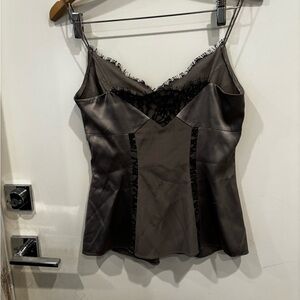 Silk camisole featuring intricate black lace trim. Thin adjustable straps. Smooth gray fabric with subtle sheen. Elegant layering piece for day or night.