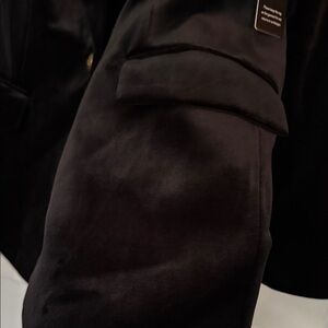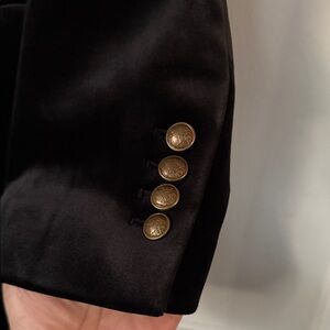 Sleek velvet blazer with a single gold-tone button. Structured lapel and tailored fit. Front flap pockets for a classic look. Luxurious soft sheen for evening or work wear.