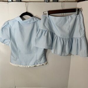 Chic blue striped two-piece set with a button-up top and ruffled skirt. Perfect for a stylish look.