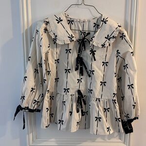 Lightweight ivory blouse with an all-over black bow print. Features a ruffled peter pan collar, tie-front bows, and a peplum hem for a feminine silhouette. Three-quarter sleeves with tie cuffs add delicate detail. A versatile top that pairs well with jeans or skirts.