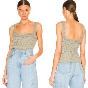 Chic crochet knit tank top in a lovely gray shade. Ideal for layering or wearing solo.
