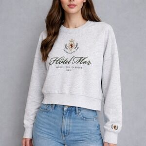 Abercrombie & Fitch Soft A&F Collection gray sweatshirt with Hotel Mer embroidery. This crewneck sweatshirt features an embroidered crest and Hotel Mer text with Paris coordinates. Ribbed cuffs and hem complete the look. Made from a cotton polyester blend.