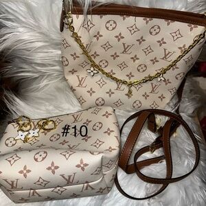 Stylish Louis Vuitton shoulder bag set. Features iconic monogram design. Cream and brown colors. Elegant and versatile.