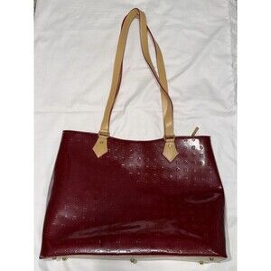 Elevate your style with this authentic Arcadia handbag. Made in Italy, this bag features a stunning deep red patent leather with an elegant embossed monogram pattern throughout. Its a spacious and structured tote, perfect for work, travel, or everyday luxury.