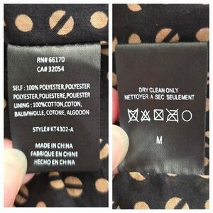 Black polyester with leather and lace trimmed lapels. High-low hem with shorter cropped length in back. Open waterfall front. Full polka dot lining.