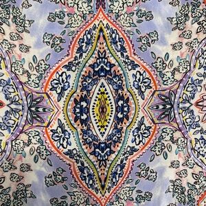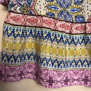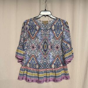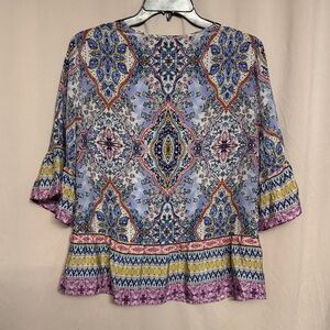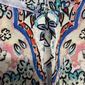 Lightweight floral print blouse with feminine ruffle sleeves. Features pastel pink, blue, yellow and white tones for a soft, versatile look, hook front closure. Relaxed silhouette that pairs easily with jeans or skirts. Easy-care fabric for everyday comfort. Note: material and care tags were removed but according to the brand it’s silk.