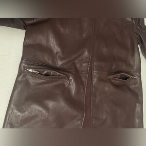 Sleek and stylish leather jacket. Features a rich brown hue. Ideal for versatile wear.