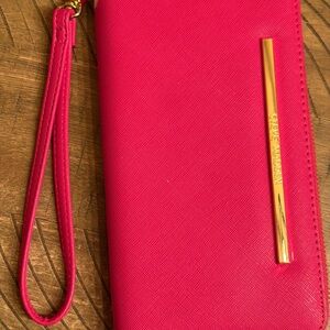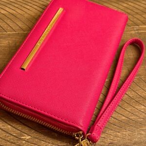 Chic Steve Madden wallet in vibrant pink. Features a sleek gold accent and convenient wrist strap. Perfect for stylish organization.