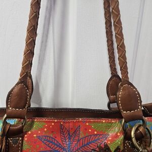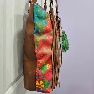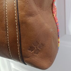 *EUC - Patricia Nash Rena Leather Tropical Summer Festival Tote. Vibrant multicolor tote featuring a Bold Pineapple motif and playful fringe charm. Stylish brown leather braided handles and trim provide sturdy support. Eye-catching green, red, blue and orange hues brighten any outfit. Lightweight and roomy for everyday essentials.