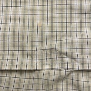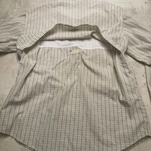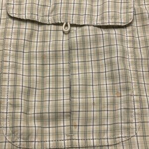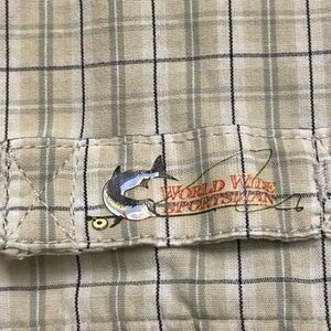 Introducing the WORLD WIDE SPORTSMAN Men's Long Sleeve Fishing Shirt in Plaid Tan/Green, Size M. This shirt is perfect for travel and casual occasions. It features a button-down collar style and a regular fit. The shirt is made from lightweight and breathable material, which makes it comfortable to wear all day long. In addition, the shirt comes with pockets to store small items. The plaid pattern and fish theme make it a stylish addition to your wardrobe. Whether you're going on a fishing trip or just out for a casual day, this shirt is a must-have. Shirt is in good, pre-loved condition, with a few spall spots on front pocket and one on back of shirt (see pics).