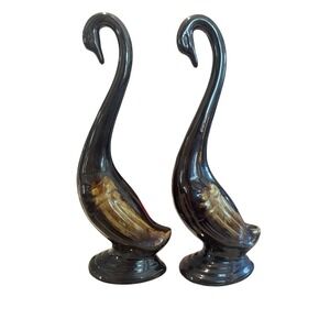 Vintage ceramic swan figurines feature a striking deep espresso brown glaze with golden-tan wing accents. These elegant statues showcase a graceful, elongated neck design characteristic of mid-century modern bird decor. The pair is crafted with a high-gloss finish that catches the light beautifully, making them a sophisticated addition to a mantle, bookshelf, or vanity. Each piece stands on a stable circular base and remains in excellent vintage condition.