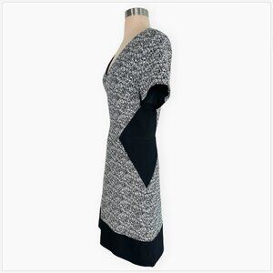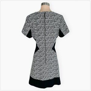 Fully lined. Back zip closure. V-neckline. Short sleeves. Black and white patterned fabric with contrasting black inset trim giving a slimmer illusion.