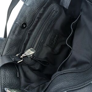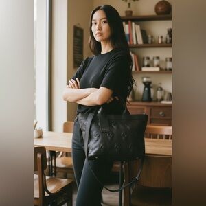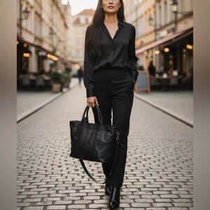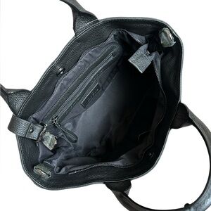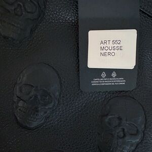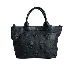 New! Made in Italy. IO Pelle Genuine Black Grained Pebbled Leather Tote Bag. Embossed Skulls Front and Back. Price Firm! Crossbody Strap included. This Bag Style is seen in two Sizes: This one is a Size Medium. It measures W-15” at the top (tapers down) x H-10” x D-6”. The other Size Bag is much Larger (like a weekender size-bag 17-13” by comparison). Please check the measurements to ensure you’re selecting the size you want. Both sizes have same features. Dual Top Leather Handles, Detachable Adjustable Crossbody Strap included. Top Zip Closure. Interior: Zip Pocket and 2 Slip Pockets. Last pic shown in Women’s Size Medium Jacket for Size Reference. Model pics AI generated.