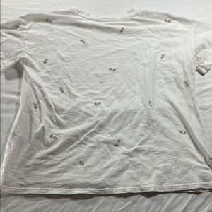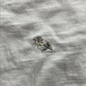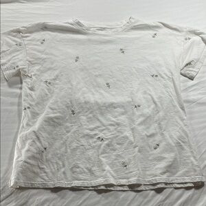 Soft white short sleeve tee with delicate scattered floral embroidery. Lightweight and breathable for everyday wear. Clean, minimal design that pairs easily with jeans or skirts. Features small embroidered accents in a neutral tone for subtle interest.