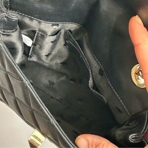 This sophisticated black quilted shoulder bag features elegant gold chain straps, offering a chic and timeless look. Ideal for elevating any outfit. Flap closure with twist metal closure. Inside has saying lining with spade print and slip in pocket. 9” x 7” x 3”. Thick gold chain strap can be worn doubled as a shoulder bag (12” strap drop) or as a crossbody (23” strap drop).