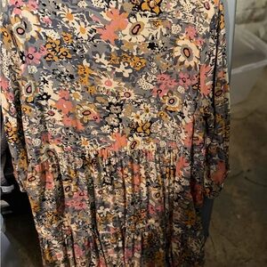 Flowy mini dress by NATURAL LIFE. Gray base with pink and mustard floral print. Button-front yoke and tiered skirt. Three-quarter sleeves with elastic cuffs. Boho casual style.