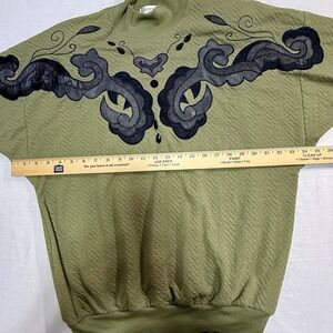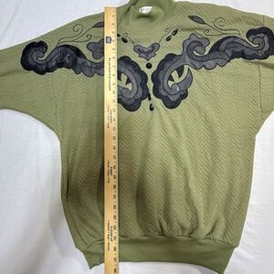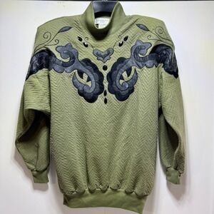 Adolfo Sport Women's M Green Textured Sweater Black Faux Leather Embellishments