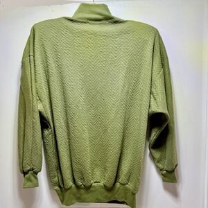 The Adolfo Sport Women's M Green Textured Sweater with Black Faux Leather Embellishments is a stylish and versatile piece perfect for various occasions such as travel, parties, casual outings, and workwear. The sweater features a classic long sleeve design with embellishments adding a touch of flair. Made from a blend of faux leather, polyester, and cotton, it offers a comfortable regular fit. With a vintage charm and accents like shoulder pads, this pullover sweater captures the essence of 80s and 90s fashion, making it a timeless addition to any wardrobe.