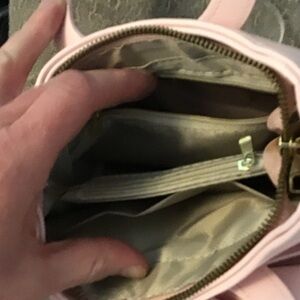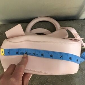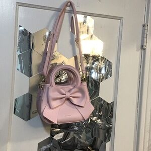 Charming pink mini handbag featuring a decorative bow and structured top handles. Includes a removable shoulder strap for hands-free wear. Smooth finish and feminine pink hue complement both casual and dressy looks.