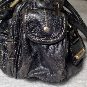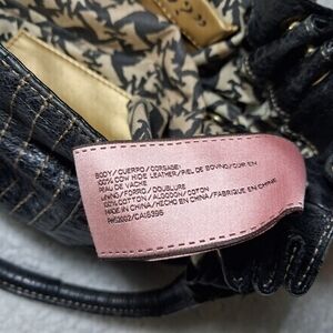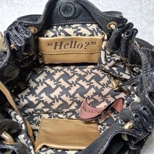 Vintage Y2K Juicy Couture black leather satchel handbag. Features crown lock closure, Juicy Couture hardware plate, and signature Scottie dog print interior lining. Includes heart mirror charm. Made of genuine cowhide leather with cotton lining. Multiple interior pockets including “Hello?” phone pocket. Classic early 2000s Juicy Couture style.