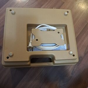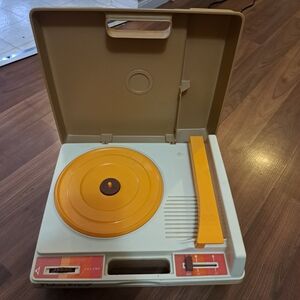 Compact portable record player. Cream body with mustard yellow platter and tonearm. Simple controls and built-in handle for easy carrying. Retro styling. Great for display or use.