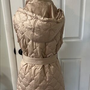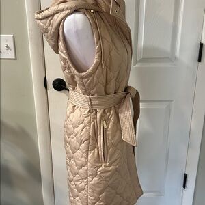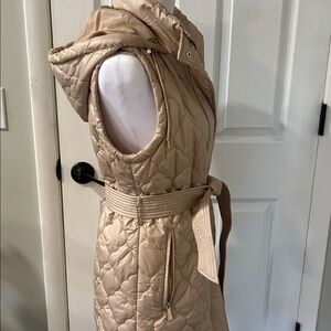 lThis hooded vest features a distinctive quilted pattern, a self-tie belt at the waist, and gold-tone hardware.