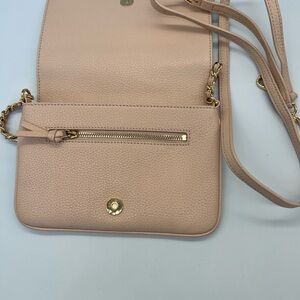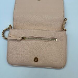 Tory Burch women’s Thea blush/pink moon/sweet melon pebbled leather shoulder bag with gold-tone chain strap.