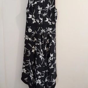 Dressy Black & White Floral Print Sleevless lined dress with handkerchief hem.