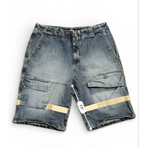 These are pre-owned vintage late 90s to early 2000s Marithé François Girbaud men's denim shorts in a faded blue acid wash, size 38. They feature a button and zipper closure, front and back pockets, and two cargo pockets on the sides. A beige strap with "M+FG" branding is visible across the lower thigh on both legs. The shorts show signs of wear consistent with pre-owned denim, including some fading and creasing. The material is 100% cotton, made in Hong Kong.