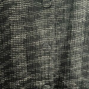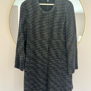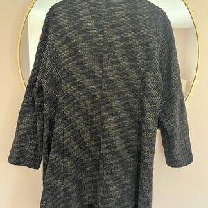 Elegant 100% cotton double knit longline jacket. Black with subtle beige pattern throughout. Covered snap closure, nice drape. Versatile and chic--can be worn with jeans or over a linen dress. Gently worn, from a smoke/pet free home.