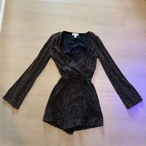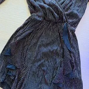 Chic long sleeve dress with a wrap design. Features shimmering gold accents. Ideal for stylish outings.