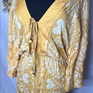 Sunny yellow mini dress with white floral and heart motifs. Deep V-neck with adjustable tie-front. Elastic waist for a gentle shape. Long sleeves and relaxed fit for easy wear.