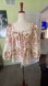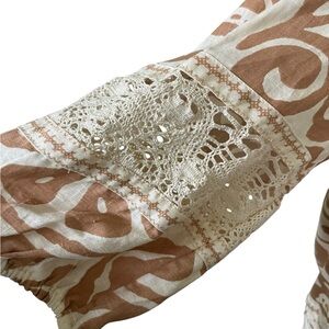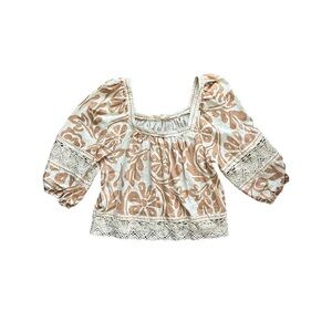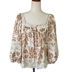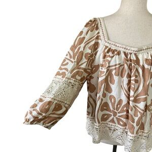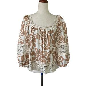 Measures 21 inches pit to pit and 24 inches shoulder to hem Stylish top featuring brown botanical patterns and intricate lace detailing along the neckline, sleeves, and hem. In like new condition