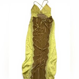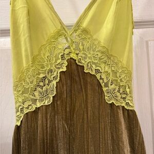 Preowned in good condition Free People Intimately Let's Get Away Maxi In Chartreuse Combo Women’s Large. The pit to pit measures approximately 17 inches and the length is 60 inches. Brown crushed velvet with a neon green silk lace trim. Cut out back with cross ties. This was only worn once however there were unknown, untreated faint black marks on the hem. The outer hem marks are barely noticeable. The inner hem is a little darker. Please refer to photos. This is a rare piece by Free People and super cute!