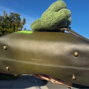 Stylish olive green bag. Features playful dinosaur design. Includes matching plush charm. Perfect for adding fun to any outfit.