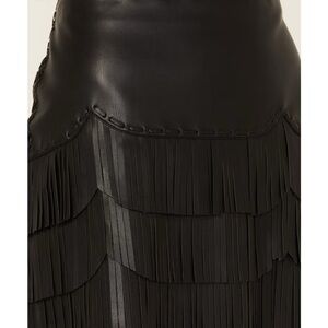 Stylish black leather skirt with fringe detail. Perfect for adding flair to any outfit.