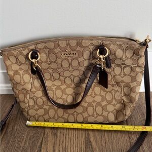 Coach shoulder bag in signature jacquard canvas. Khaki body with chestnut leather trim and gold-tone hardware. Detachable crossbody strap and top handles. Coach hangtag and logo plaque detail. Versatile, everyday silhouette.