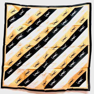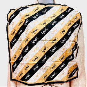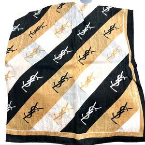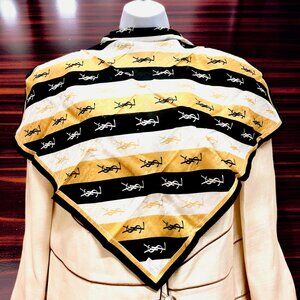 64. New with tag on - An elegance Yves Saint Laurent Scarf-Neck Handkerchief is a luxurious accessory made from very fine cotton , measuring 21.5" x21.5"., featuring beige, gold, white , black, striped pattern"YSL" printed all over with logo details. Made in Japan.