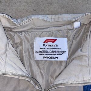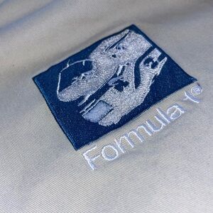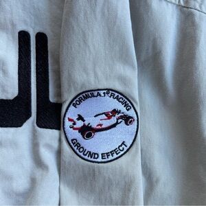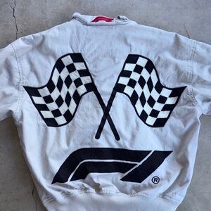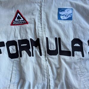 White jacket featuring a Formula Racing patch. Ideal for racing fans.