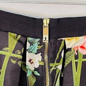 Featuring a pleated style, full zip closure, premium quality material, and a all-over floral design that radiates glamour. This feminine skirt has a gold accent back zipper, fully lined, black grosgrain ribbon style waistband. Side seam pockets. Structured full swing skirt, elegant formal skirt, perfect for day to night.